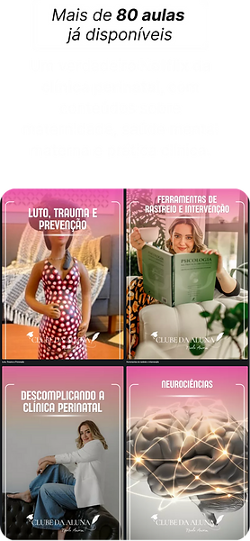 Um verdadeiro Netflix da clínica perinatal e da saúde mental materna. São aulas gravadas que você pode assistir quando e onde quiser — e todos os meses novas aulas entram na plataforma.